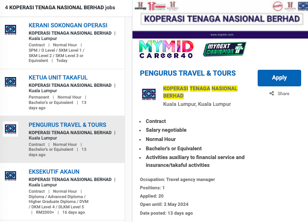 Permohonan jawatan ini boleh dibuat melalui Portal MyFutureJobs. Sila ke Portal MyFutureJobs dan Masukkan Kata Carian yang ingin dicari “KOPERASI TENAGA NASIONAL BERHAD” di bahagian carian untuk memohon jawatan yang diiklankan.