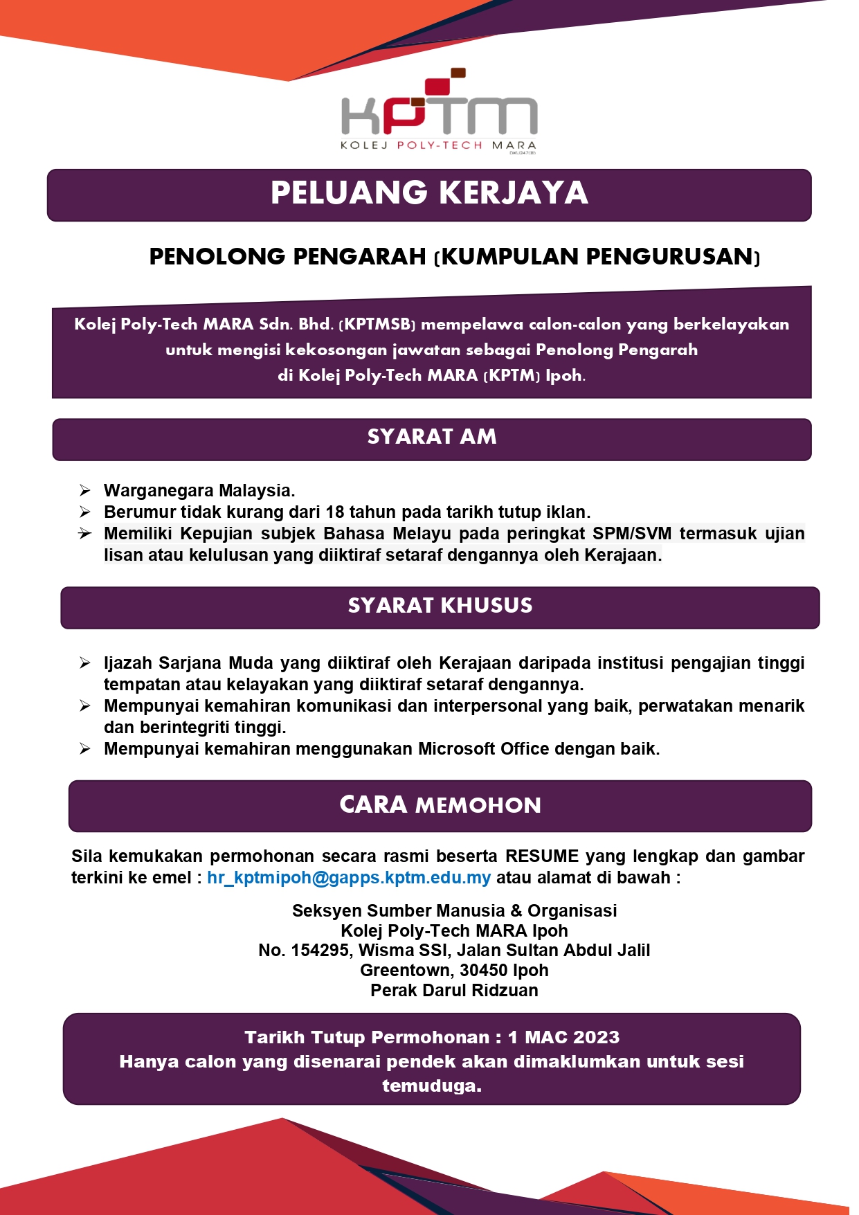 Iklan Jawatan Kolej Poly-Tech Mara (KPTM)