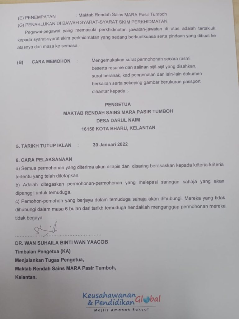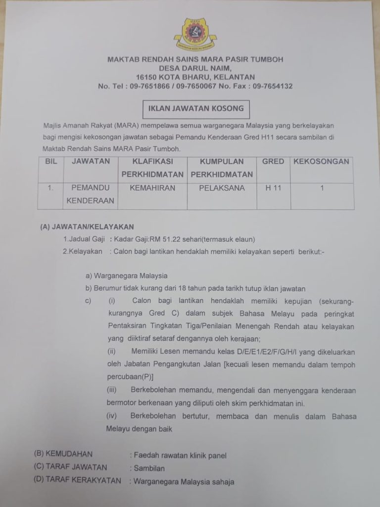 Iklan Jawatan Kosong Maktab Rendah Sains Mara (MRSM) Pasir Tumboh