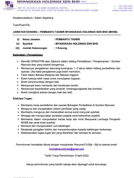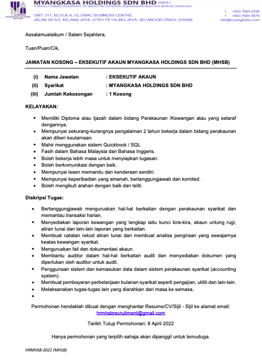 Iklan Jawatan Kosong MyANGKASA Holdings Sdn Bhd