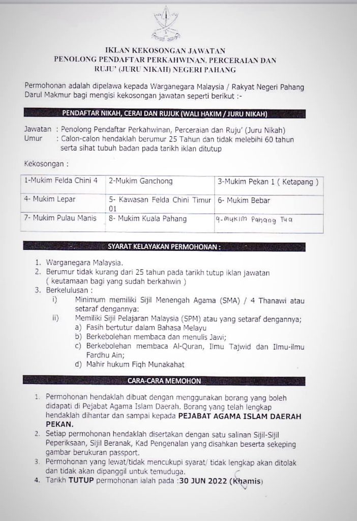 Iklan Jawatan Kosong Pejabat Agama Islam Daerah Pekan