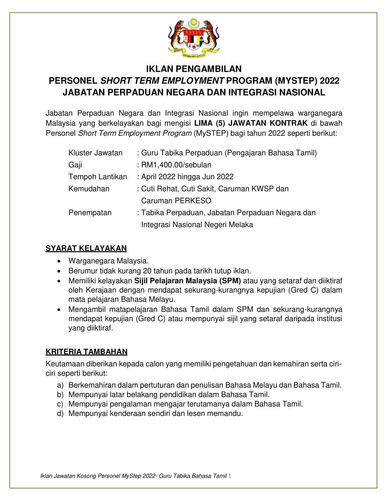 Iklan Jawatan Kosong Personel MySTEP Jabatan Perpaduan Negara Dan Integrasi Nasional (JPNIN)