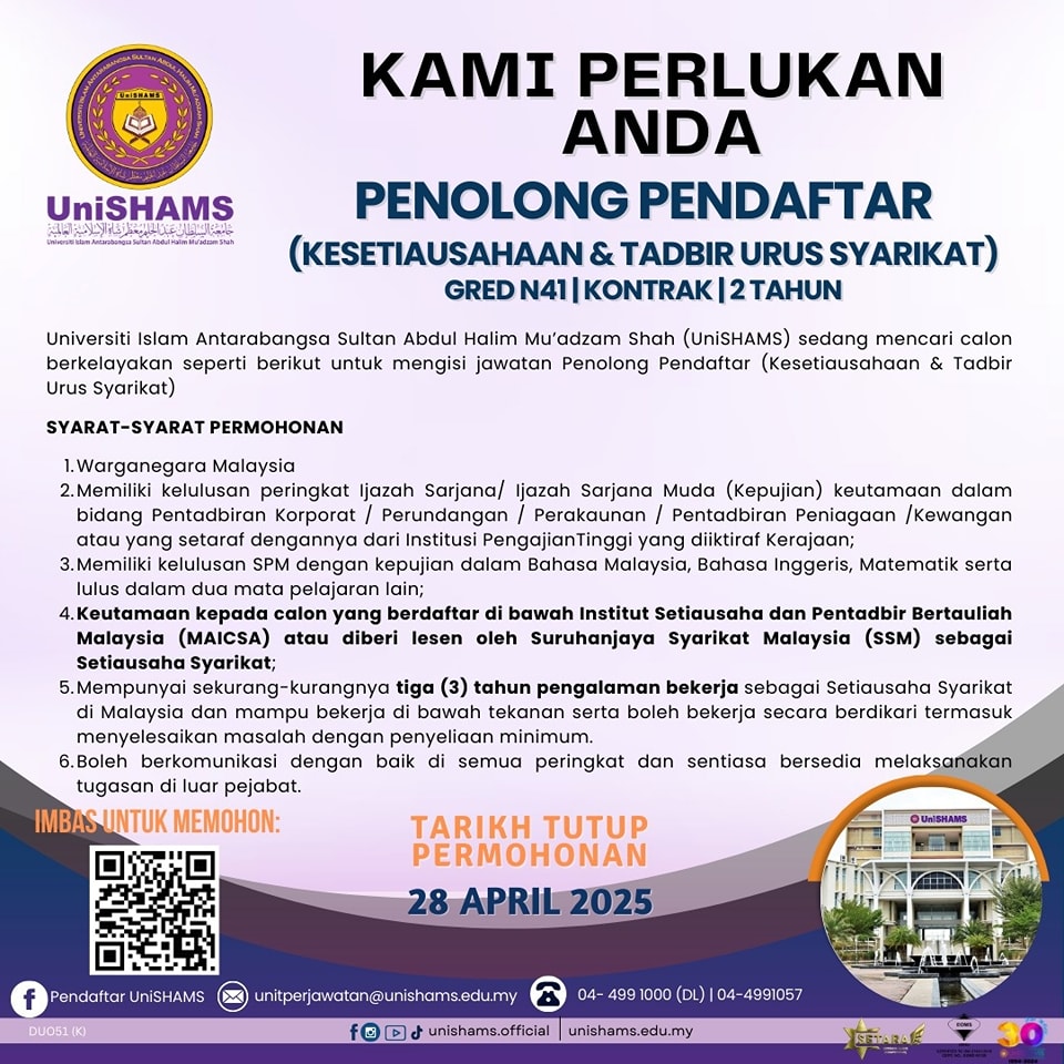 Iklan Jawatan Kosong Universiti Islam Antarabangsa Sultan Abdul Halim Mu’adzam Shah (UniSHAMS)