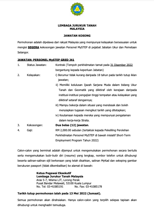 Iklan Jawatan Lembaga Jurukur Tanah Malaysia