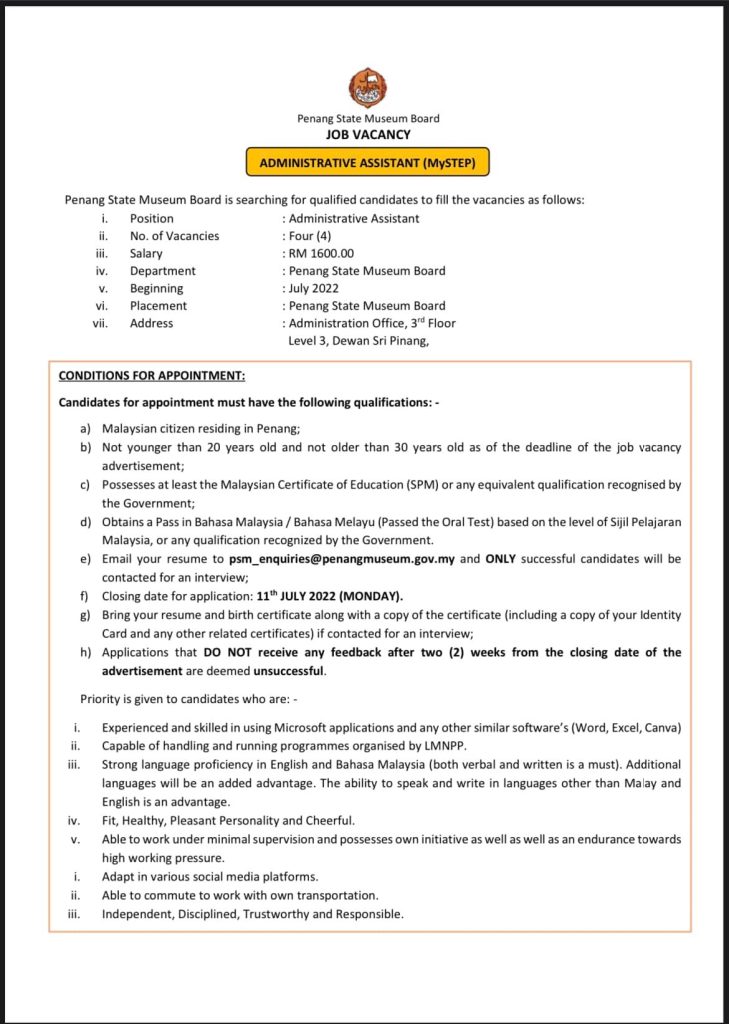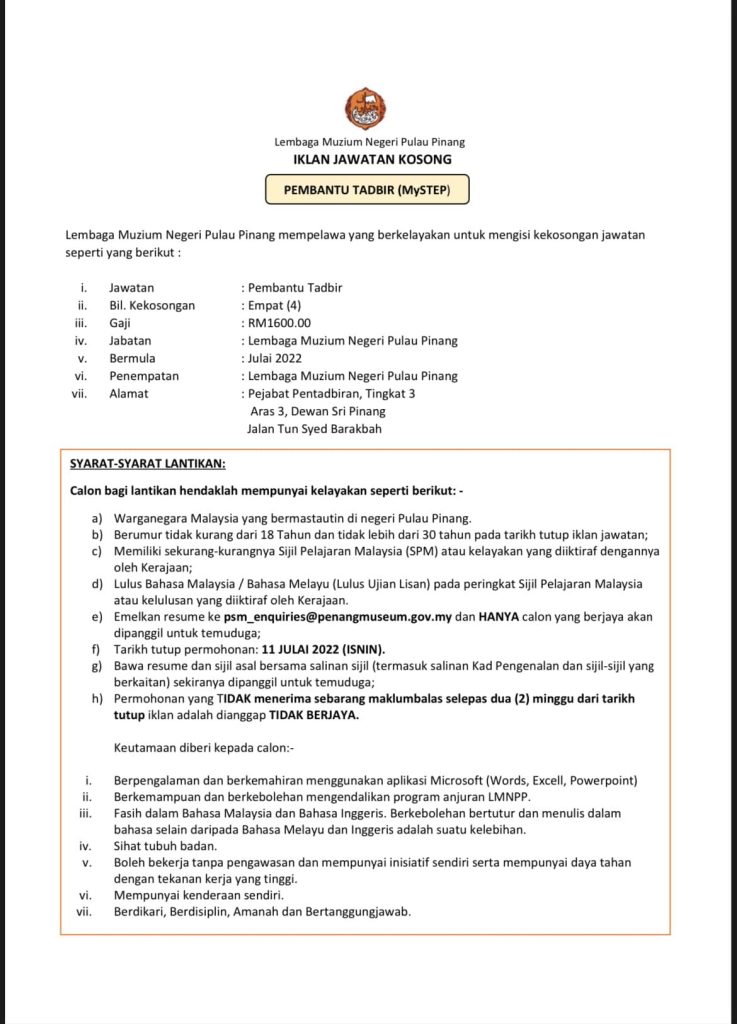 Iklan Jawatan Lembaga Muzium Pulai Pinang (LMNPP)