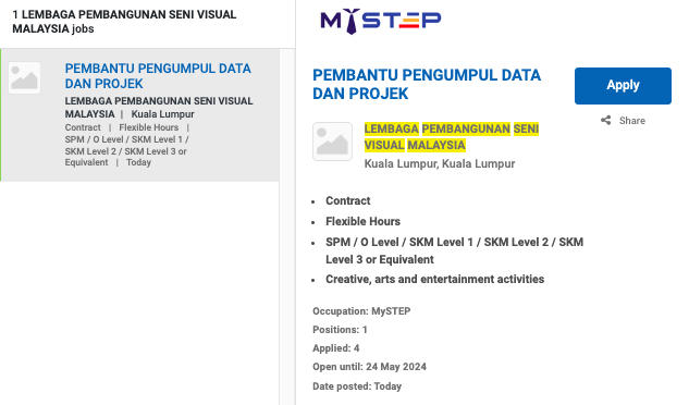 Permohonan jawatan ini boleh dibuat melalui Portal MyFutureJobs. Sila ke Portal MyFutureJobs dan Masukkan Kata Carian yang ingin dicari “LEMBAGA PEMBANGUNAN SENI VISUAL MALAYSIA” di bahagian carian untuk memohon jawatan yang diiklankan.