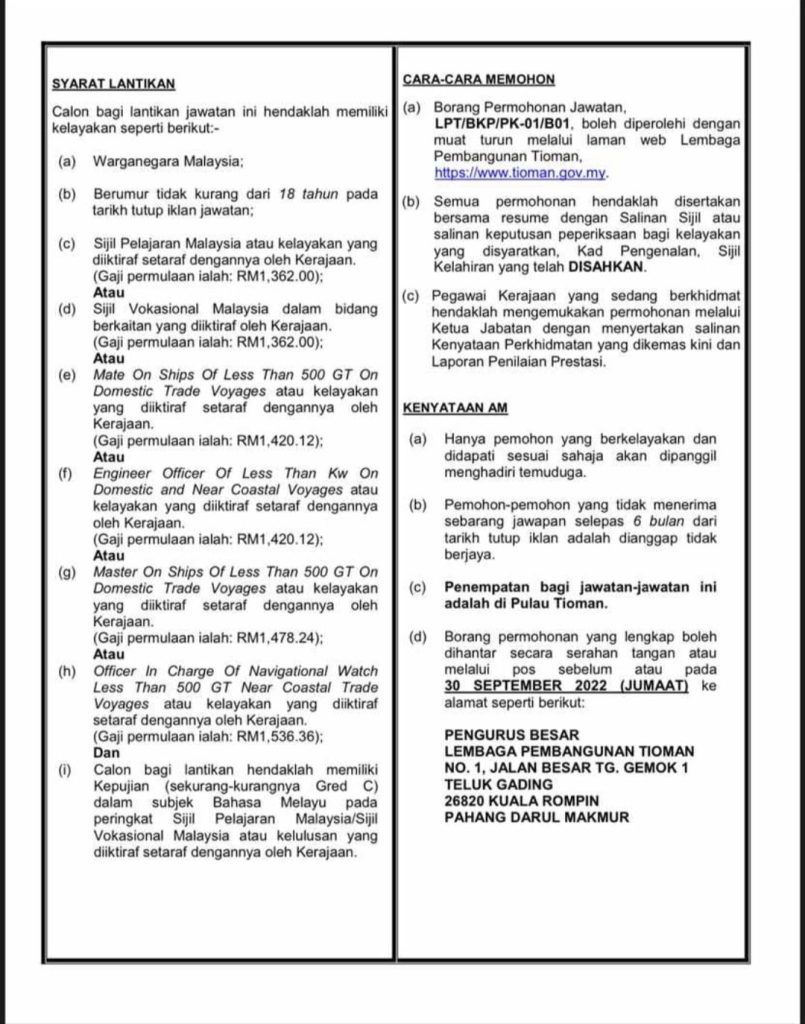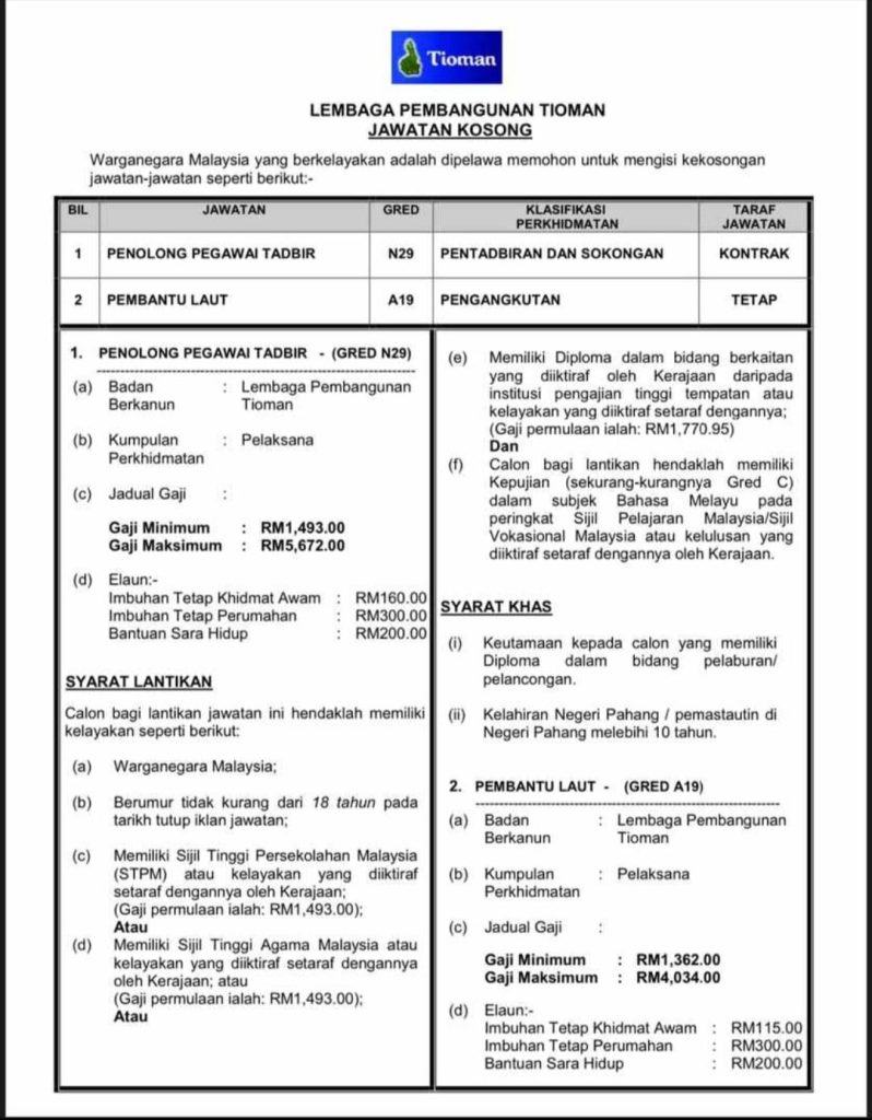 Iklan Jawatan Lembaga Pembangunan Tioman