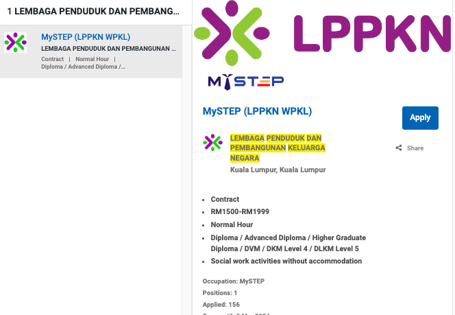 Permohonan jawatan ini boleh dibuat melalui Portal MyFutureJobs. Sila ke Portal MyFutureJobs dan Masukkan Kata Carian yang ingin dicari “LEMBAGA PENDUDUK DAN PEMBANGUNAN KELUARGA NEGARA” di bahagian carian untuk memohon jawatan yang diiklankan.