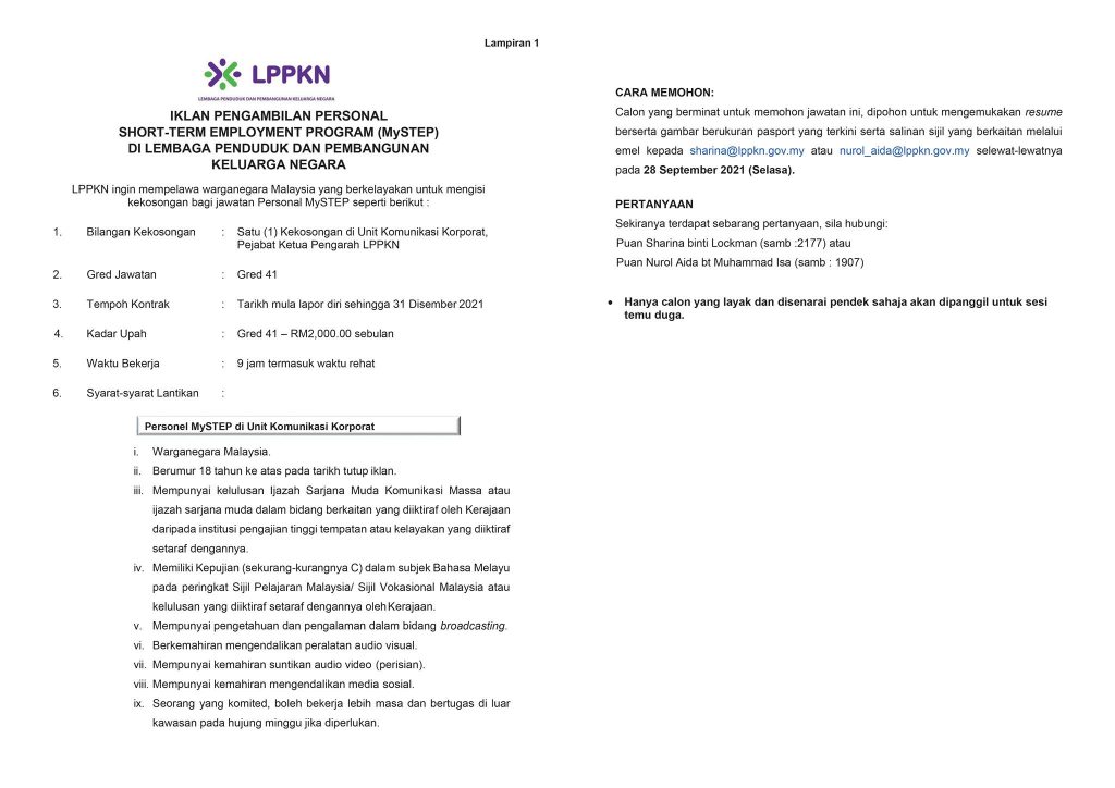 Iklan Jawatan Lembaga Penduduk Dan Pembangunan Keluarga Negara (LPPKN)