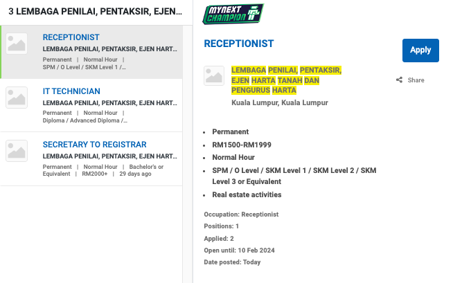 Iklan Jawatan Lembaga Penilai, Pentaksir, Ejen Harta Tanah Dan Pengurus Harta