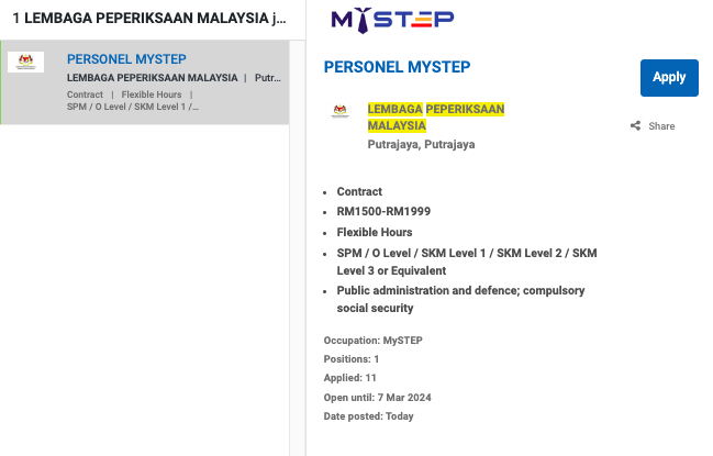 Permohonan jawatan ini boleh dibuat melalui Portal MyFutureJobs. Sila ke Portal MyFutureJobs dan Masukkan Kata Carian yang ingin dicari “LEMBAGA PEPERIKSAAN MALAYSIA” di bahagian carian untuk memohon jawatan yang diiklankan.