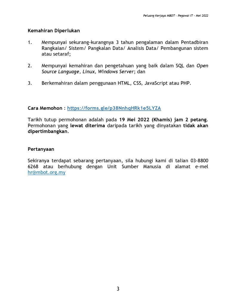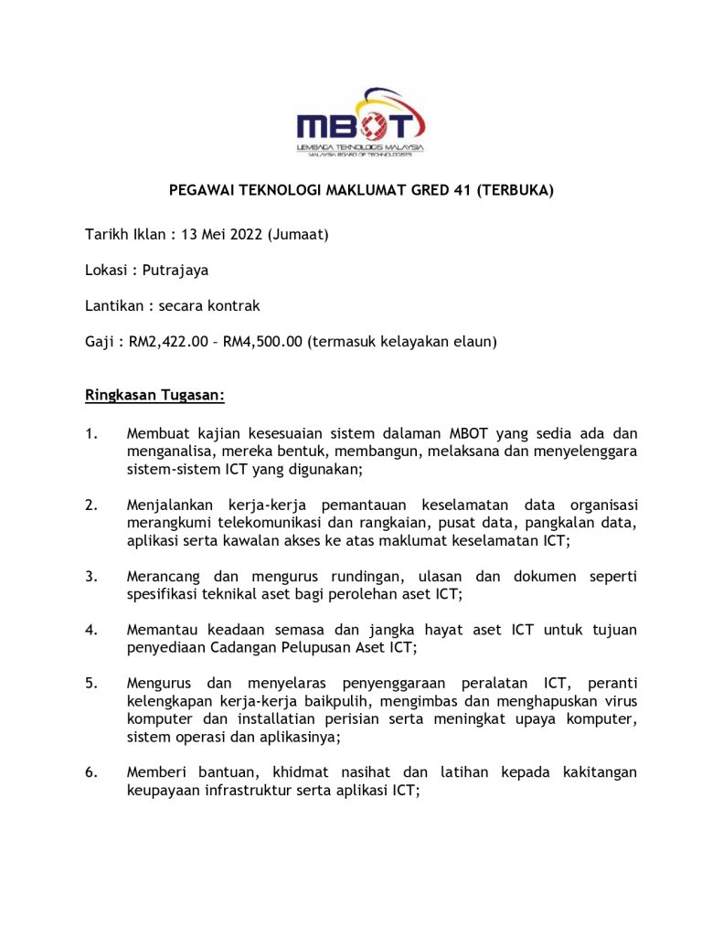 Iklan Jawatan Lembaga Teknologi Malaysia (MBOT)