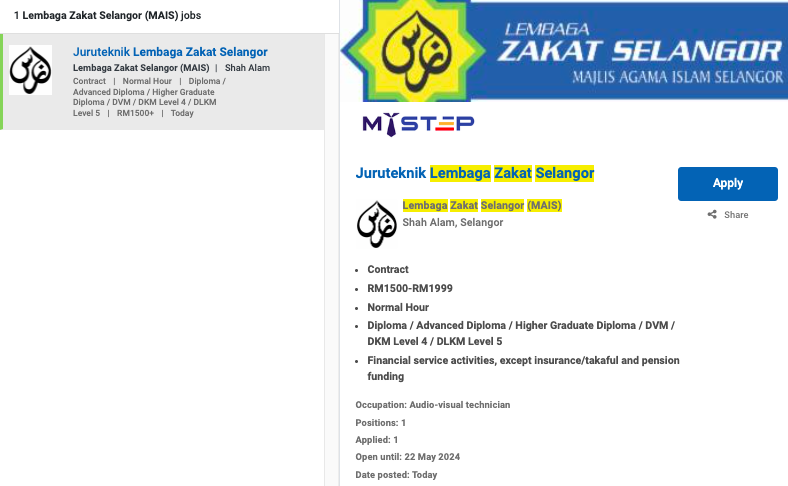 Permohonan jawatan ini boleh dibuat melalui Portal MyFutureJobs. Sila ke Portal MyFutureJobs dan Masukkan Kata Carian yang ingin dicari “Lembaga Zakat Selangor (MAIS)” di bahagian carian untuk memohon jawatan yang diiklankan.