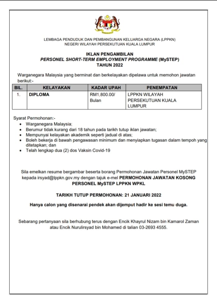 Iklan Jawatan Lembaga Penduduk Dan Pembangunan Keluarga Negara (LPPKN)