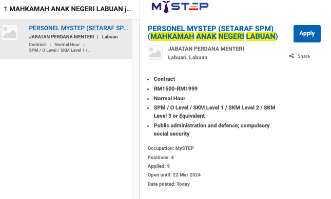 Permohonan jawatan ini boleh dibuat melalui Portal MyFutureJobs. Sila ke Portal MyFutureJobs dan Masukkan Kata Carian yang ingin dicari “MAHKAMAH ANAK NEGERI LABUAN” di bahagian carian untuk memohon jawatan yang diiklankan.