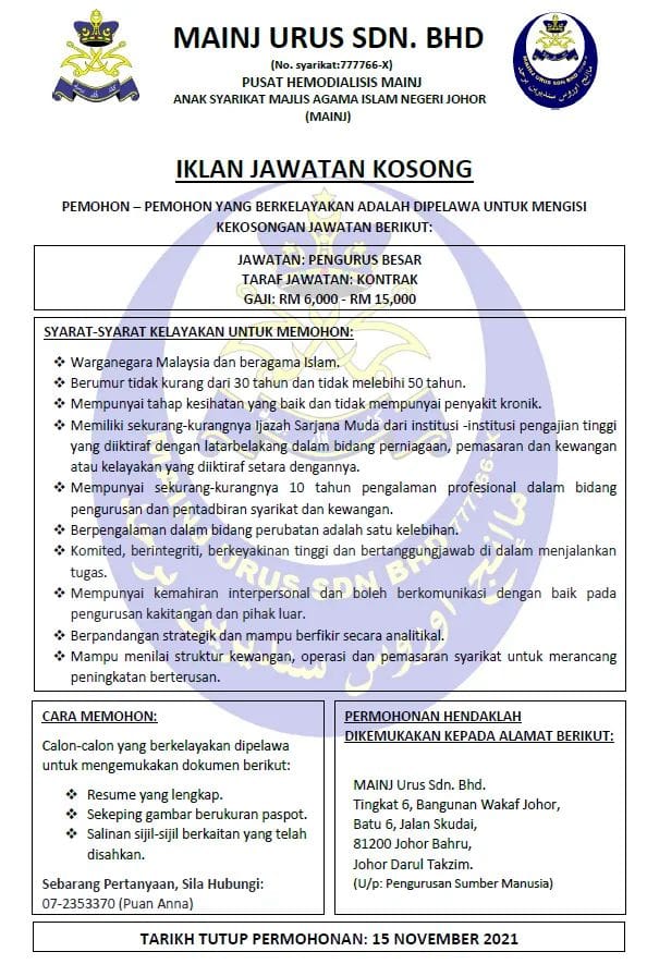 Iklan Jawatan MAINJ Urus Sdn Bhd
