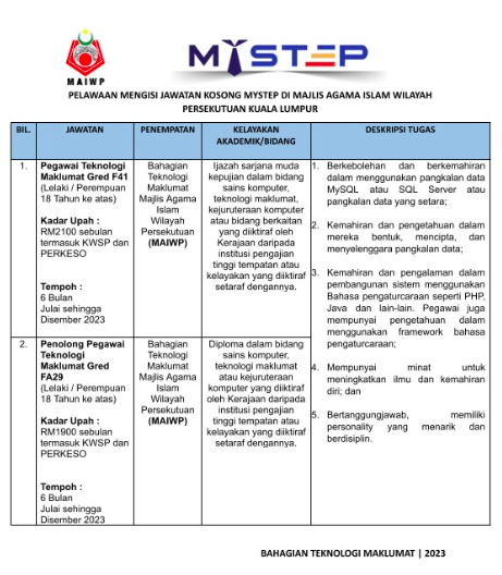 Iklan Perjawatan Pegawai MySTEP di Bahagian Teknologi Maklumat, Majlis Agama Islam Wilayah Persekutuan, Kuala Lumpur