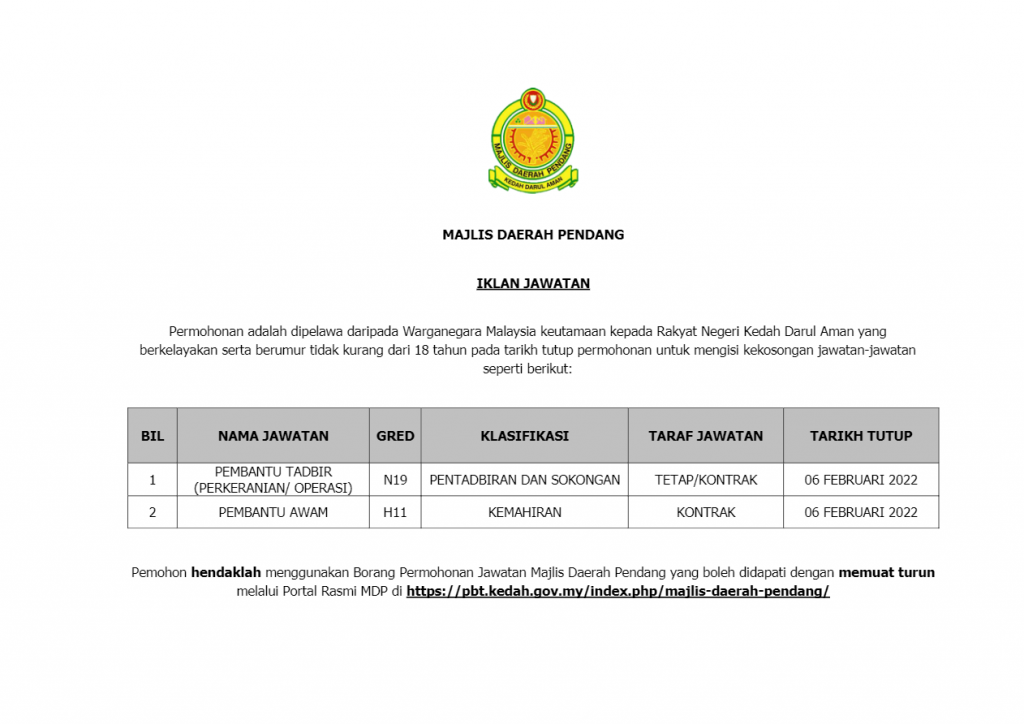 Iklan Jawatan Majlis Daerah Pendang