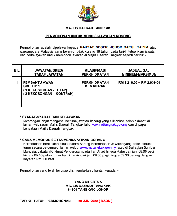 Iklan Jawatan Majlis Daerah Tangkak
