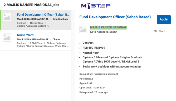 Permohonan jawatan ini boleh dibuat melalui Portal MyFutureJobs. Sila ke Portal MyFutureJobs dan Masukkan Kata Carian yang ingin dicari “MAJLIS KANSER NASIONAL” di bahagian carian untuk memohon jawatan yang diiklankan.