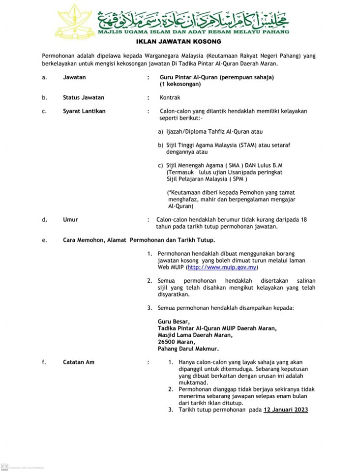 Iklan Jawatan Majlis Ugama Islam Dan Adat Resam Melayu Pahang (MUIP)