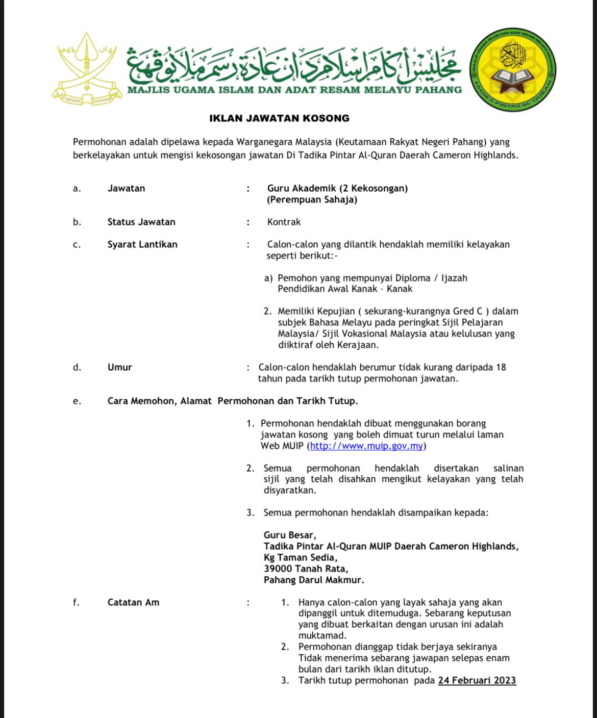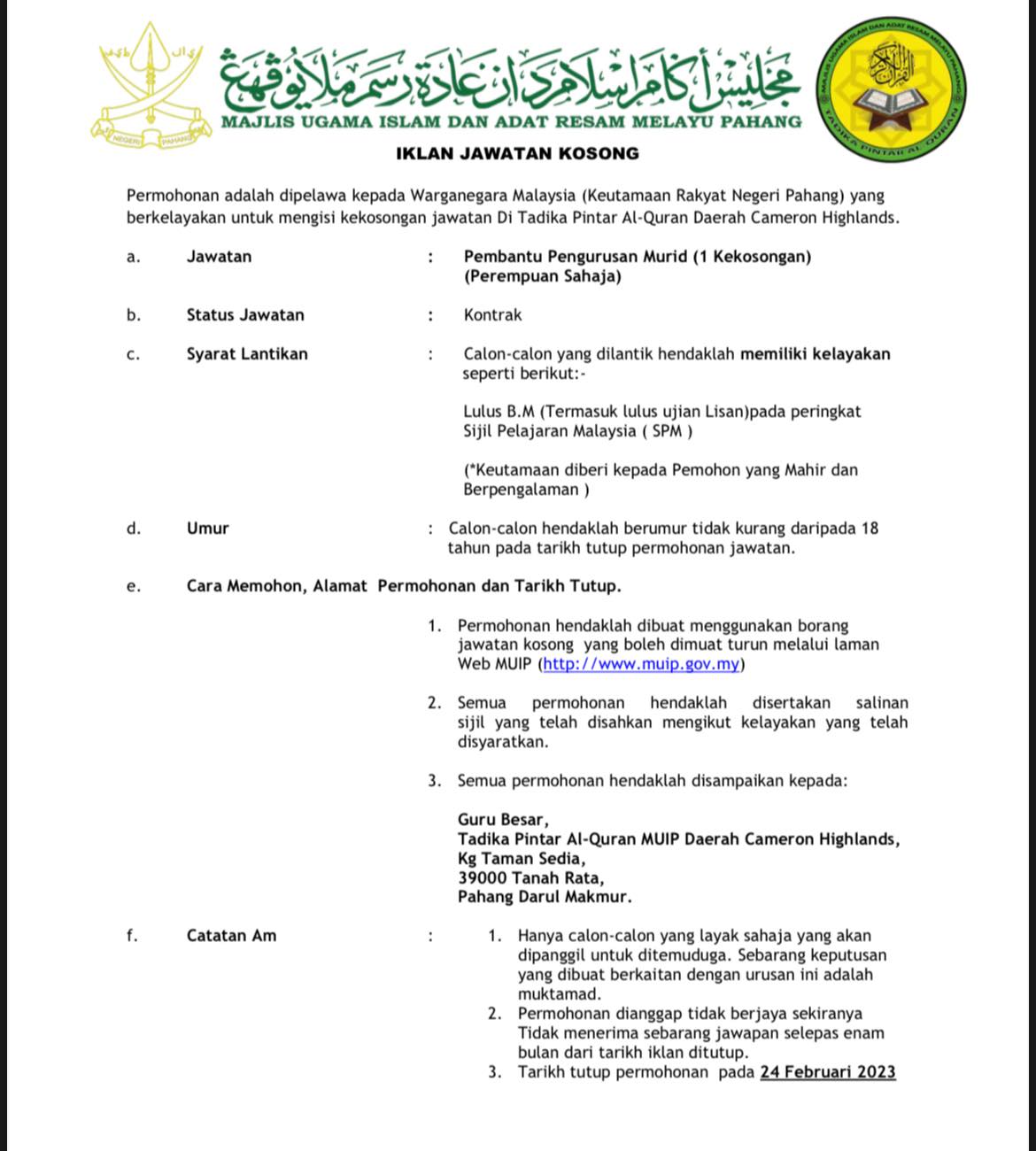Iklan Jawatan Majlis Ugama Islam Dan Adat Resam Melayu Pahang (MUIP)