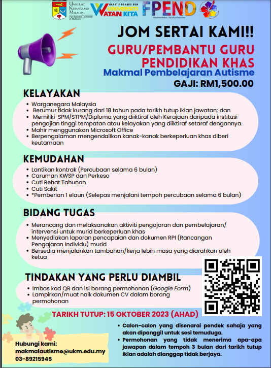 Iklan Jawatan Makmal Pembelajaran Autisme, Fakulti Pendidikan,Universiti Kebangsaan Malaysia (UKM)