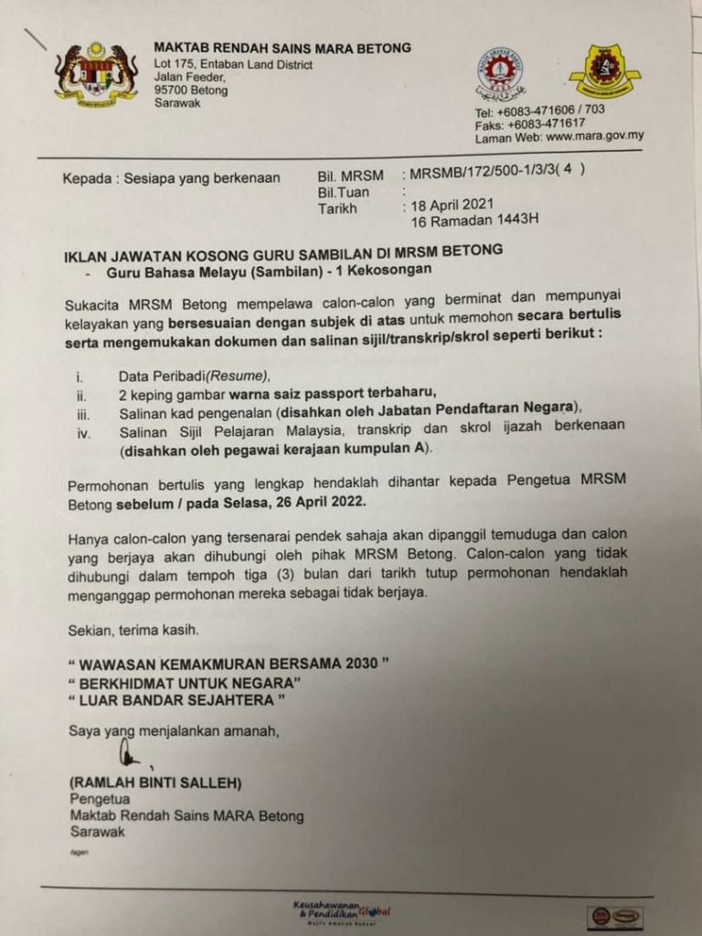 Iklan Jawatan Maktab Rendah Sains MARA Betong