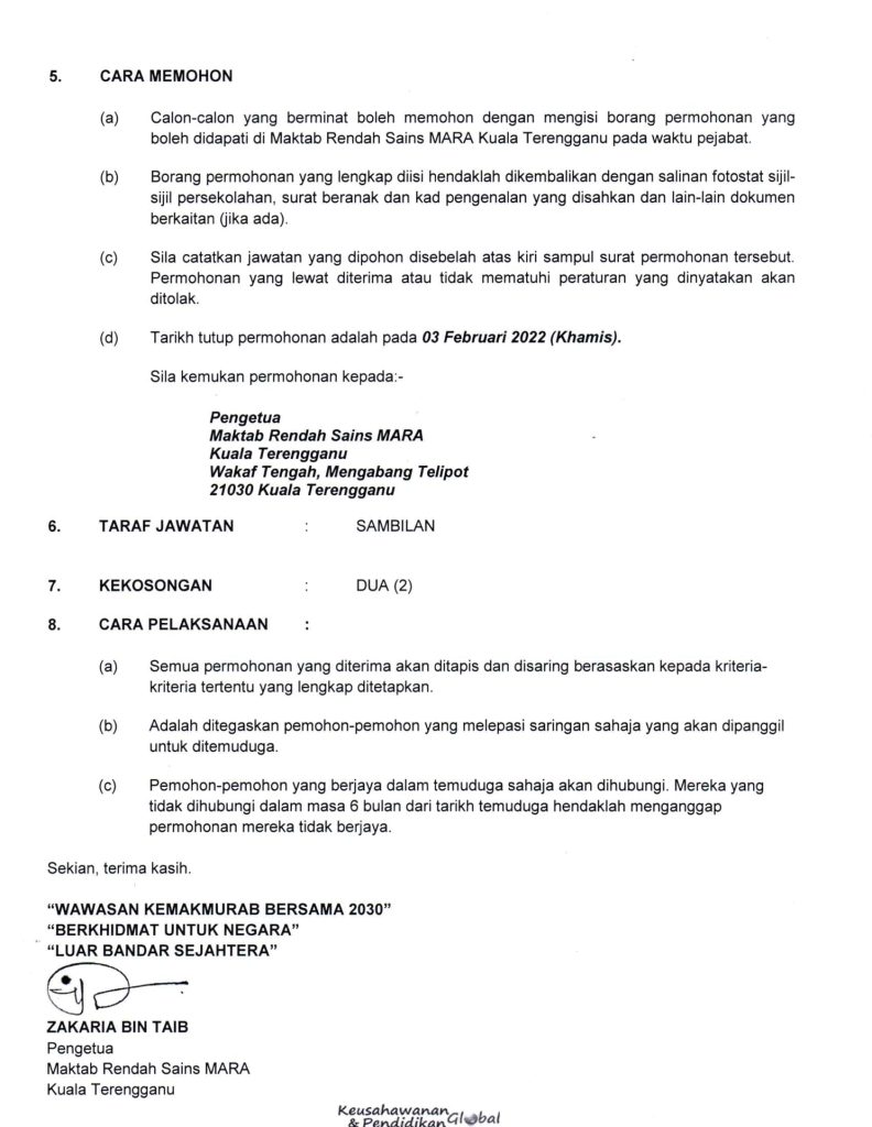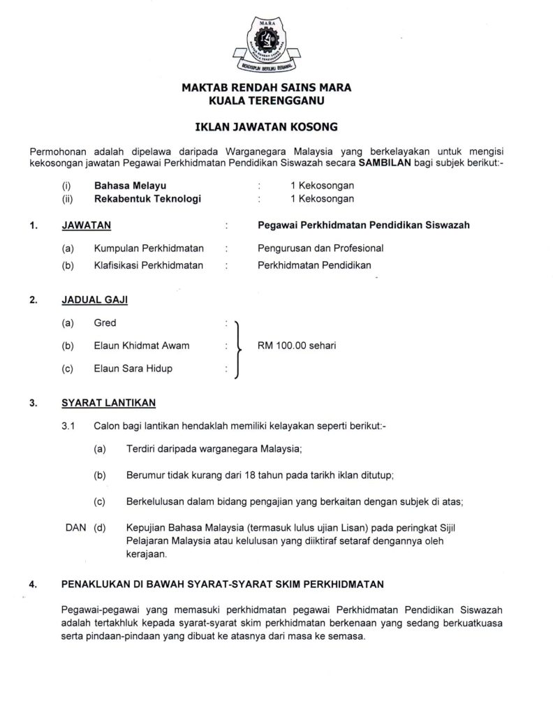 Iklan Jawatan Maktab Rendah Sains Mara (MRSM) Kuala Terengganu