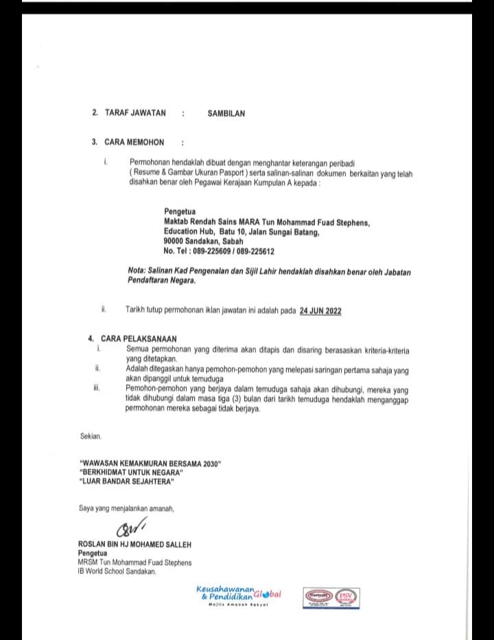 Iklan Jawatan Maktab Rendah Sains MARA Tun Mohammad Fuad Stephens