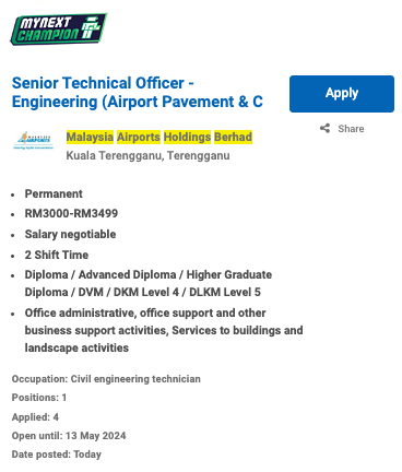 Permohonan jawatan ini boleh dibuat melalui Portal MyFutureJobs. Sila ke Portal MyFutureJobs dan Masukkan Kata Carian yang ingin dicari “Malaysia Airports Holdings Berhad” di bahagian carian untuk memohon jawatan yang diiklankan.