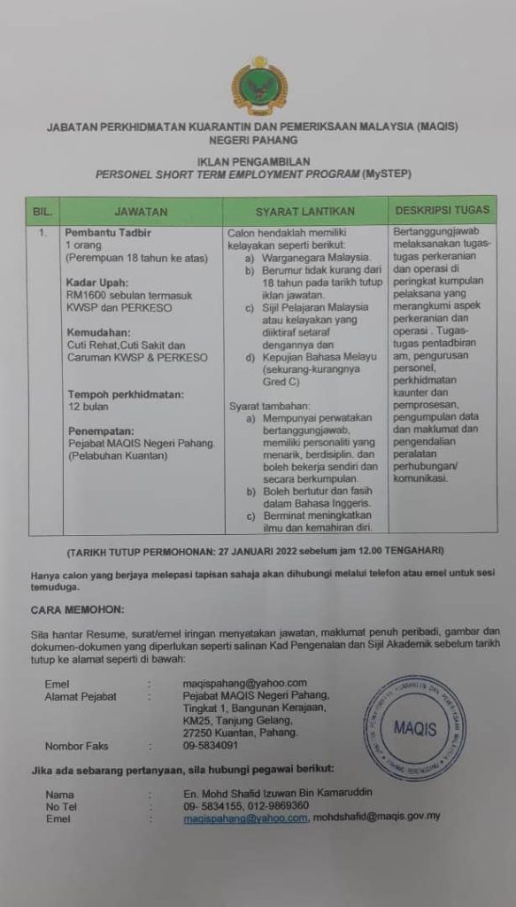 Iklan Jawatan Jabatan Perkhidmatan Kuarantin Dan Pemeriksaan Malaysia (MAQIS)