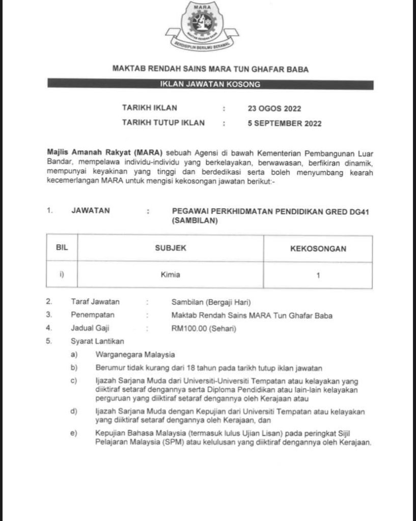 Iklan Jawatan MRSM Tun Ghafar Baba