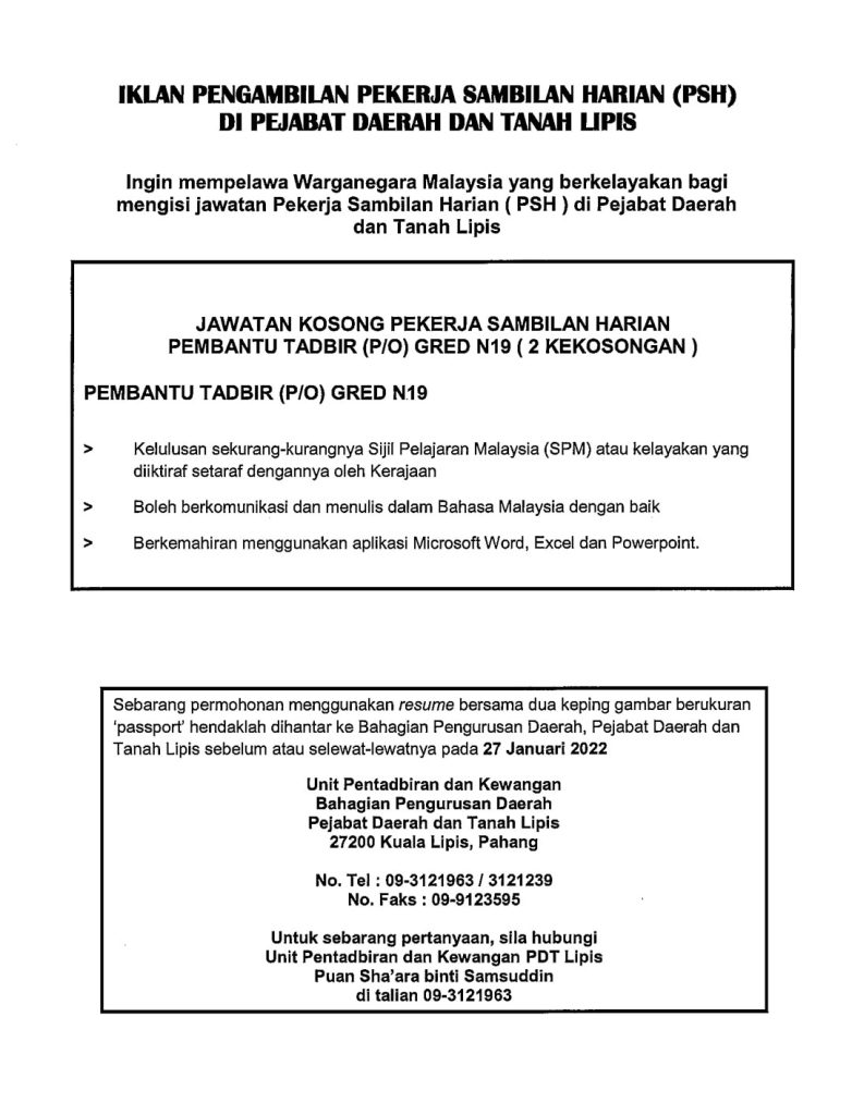 Iklan Jawatan Pejabat Daerah Dan Tanah Lipis