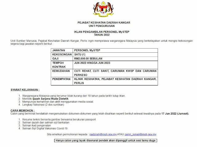 Iklan Jawatan Pejabat Kesihatan Daerah Kangar