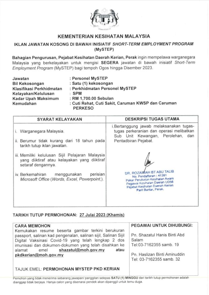 Iklan Jawatan Pejabat Kesihatan Daerah Kerian