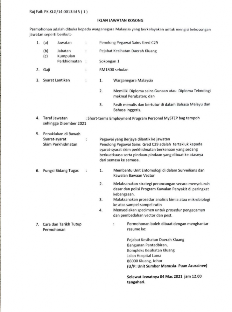 Iklan Jawatan Pejabat Kesihatan Daerah Kluang