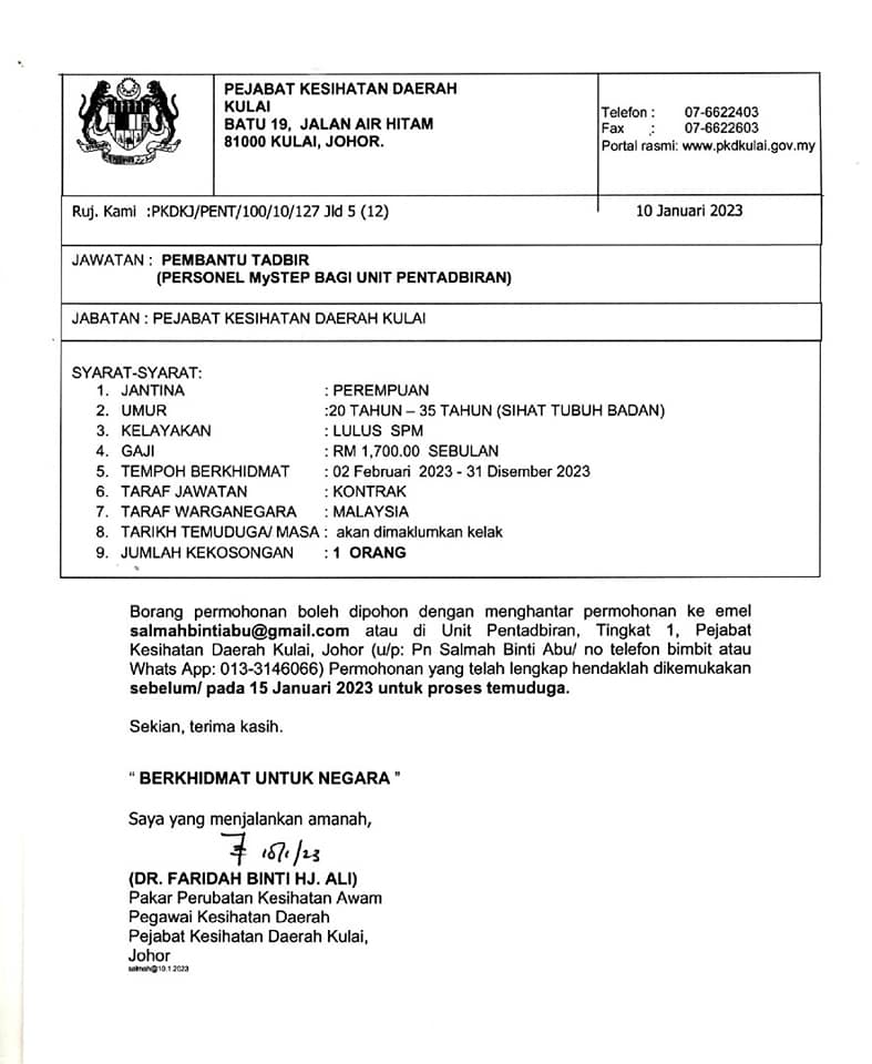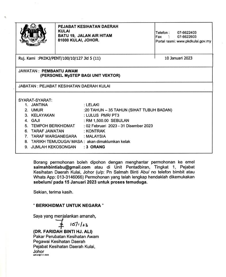 Iklan Jawatan Pejabat Kesihatan Daerah Kulai
