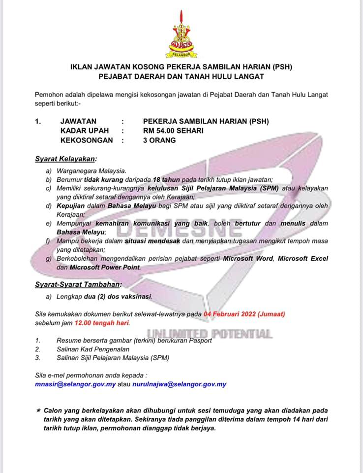 Iklan Jawatan Pejabat Kesihatan Daerah Tanah Hulu Langat