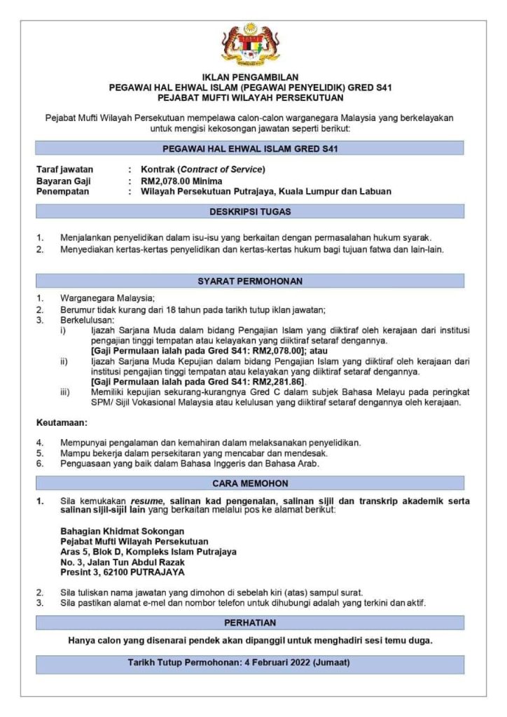 Iklan Jawatan Pejabat Mufti Wilayah Persekutuan