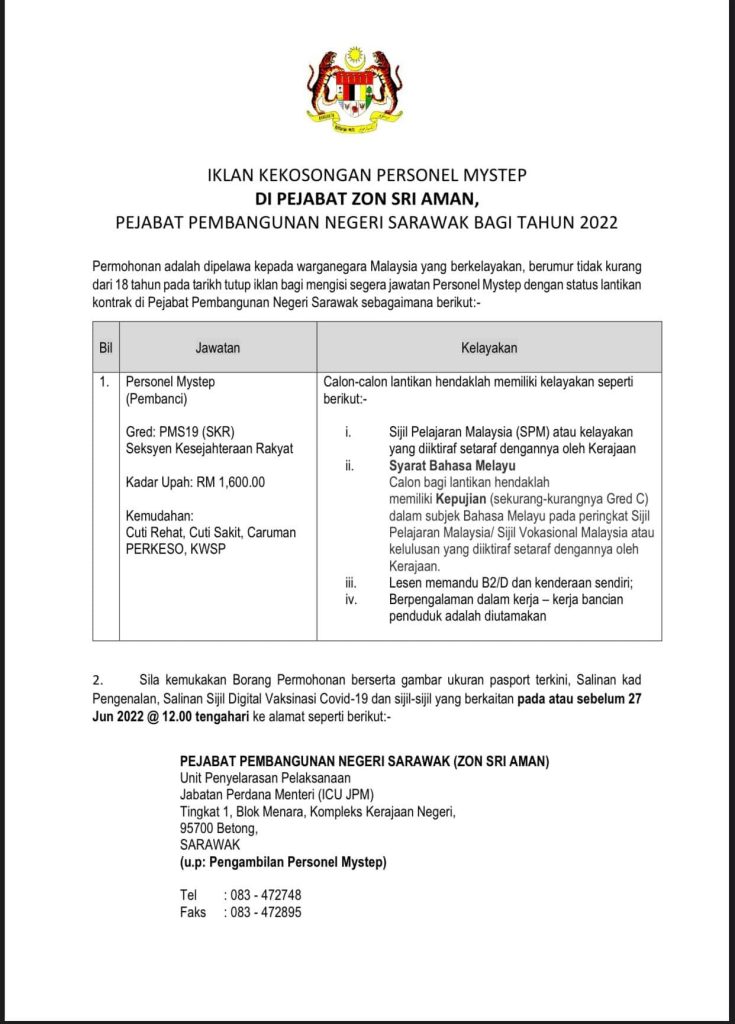 Iklan Jawatan Pejabat Pembangunan Negeri Sarawak