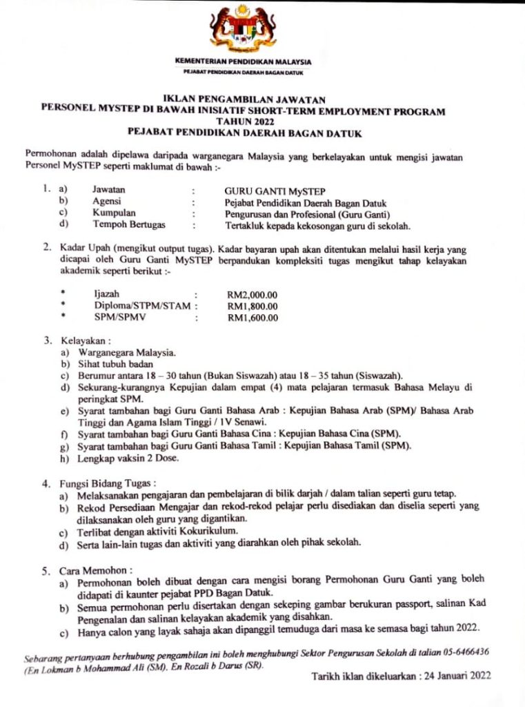 Iklan Jawatan Pejabat Pendidikan Daerah Bagan Datuk