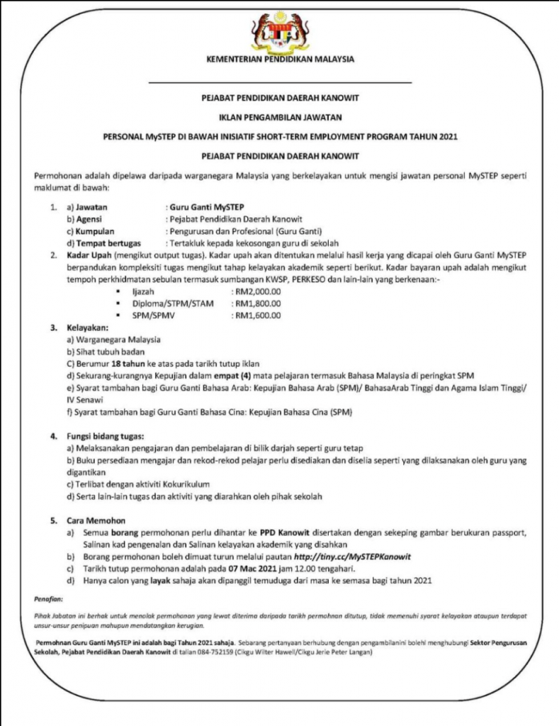 Iklan Jawatan Pejabat Pendidikan Daerah Kanowit