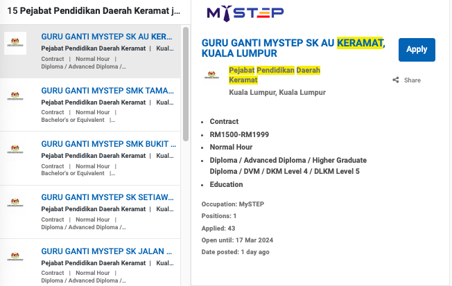 Permohonan jawatan ini boleh dibuat melalui Portal MyFutureJobs. Sila ke Portal MyFutureJobs dan Masukkan Kata Carian yang ingin dicari Pejabat Pendidikan Daerah Keramat di bahagian carian untuk memohon jawatan yang diiklankan.