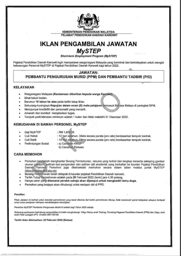 Iklan Jawatan Pejabat Pendidikan Daerah Konowit