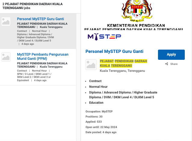 Permohonan jawatan ini boleh dibuat melalui Portal MyFutureJobs. Sila ke Portal MyFutureJobs dan Masukkan Kata Carian yang ingin dicari “PEJABAT PENDIDIKAN DAERAH KUALA TERENGGANU” di bahagian carian untuk memohon jawatan yang diiklankan.