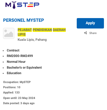 Permohonan jawatan ini boleh dibuat melalui Portal MyFutureJobs. Sila ke Portal MyFutureJobs dan Masukkan Kata Carian yang ingin dicari “PEJABAT PENDIDIKAN DAERAH LIPIS” di bahagian carian untuk memohon jawatan yang diiklankan.