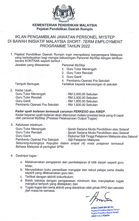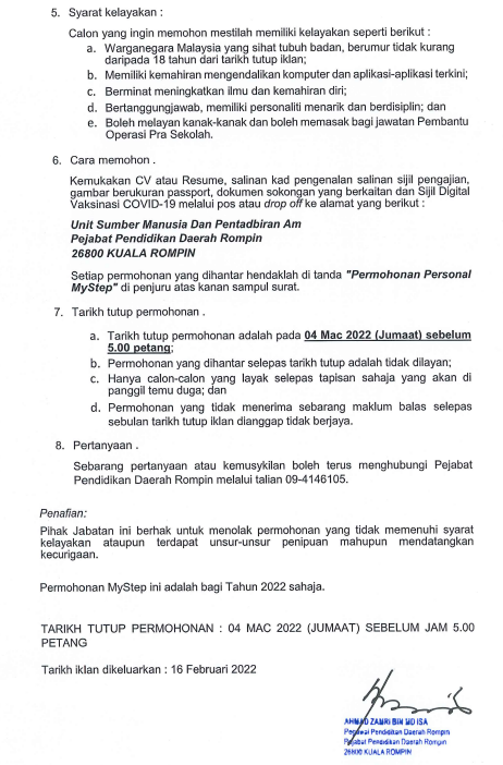 Iklan Jawatan Pejabat Pendidikan Daerah Rompin