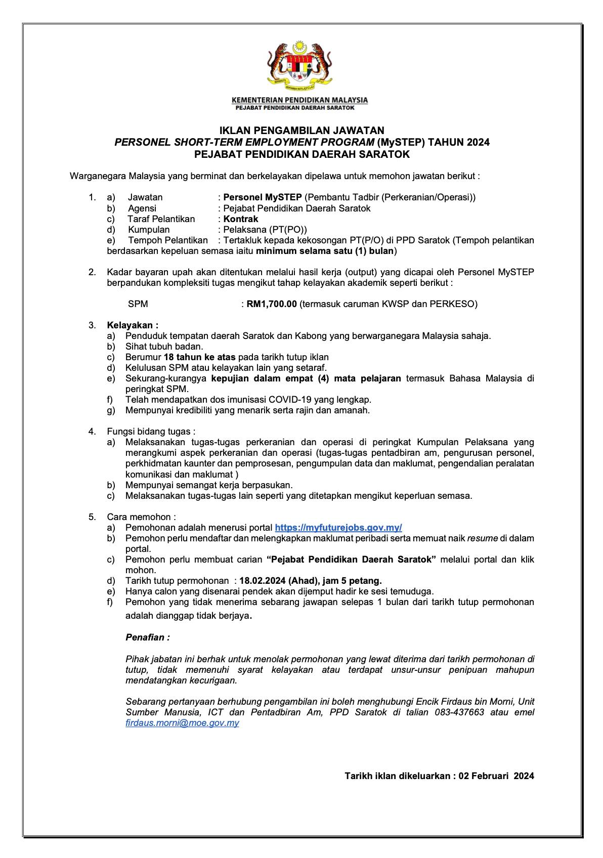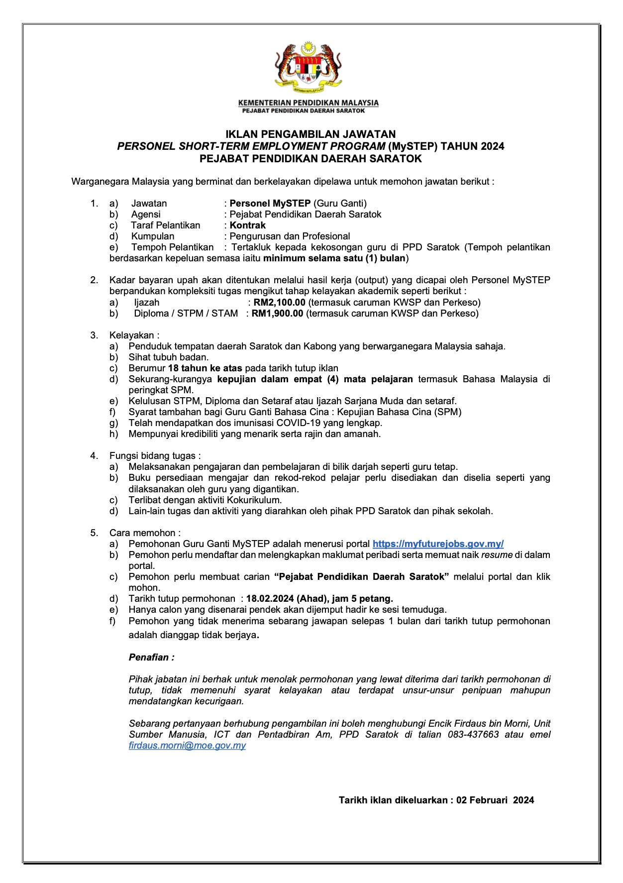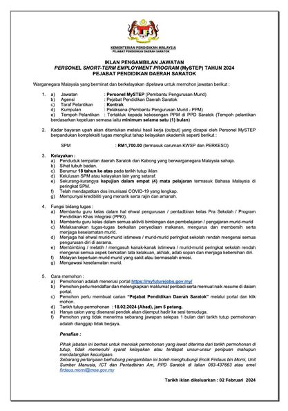 Iklan Jawatan Pejabat Pendidikan Daerah Saratok