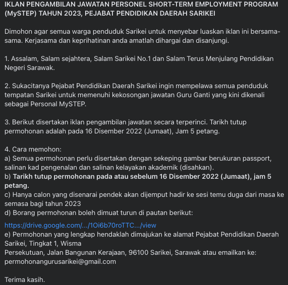 Iklan Jawatan Pejabat Pendidikan Daerah Sarikei
